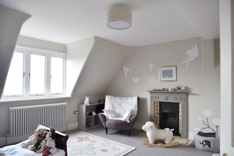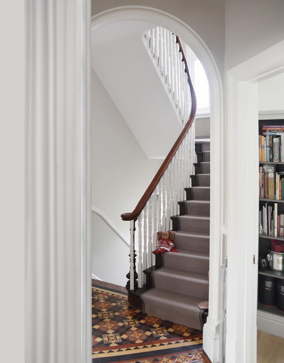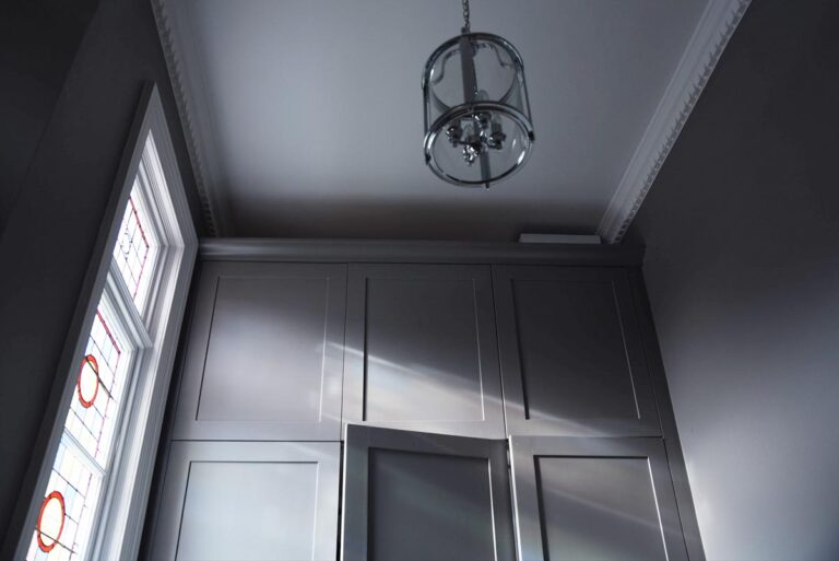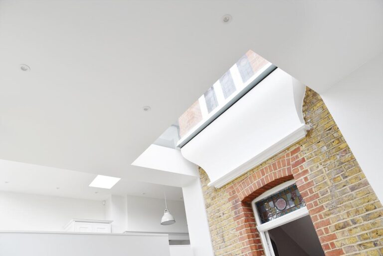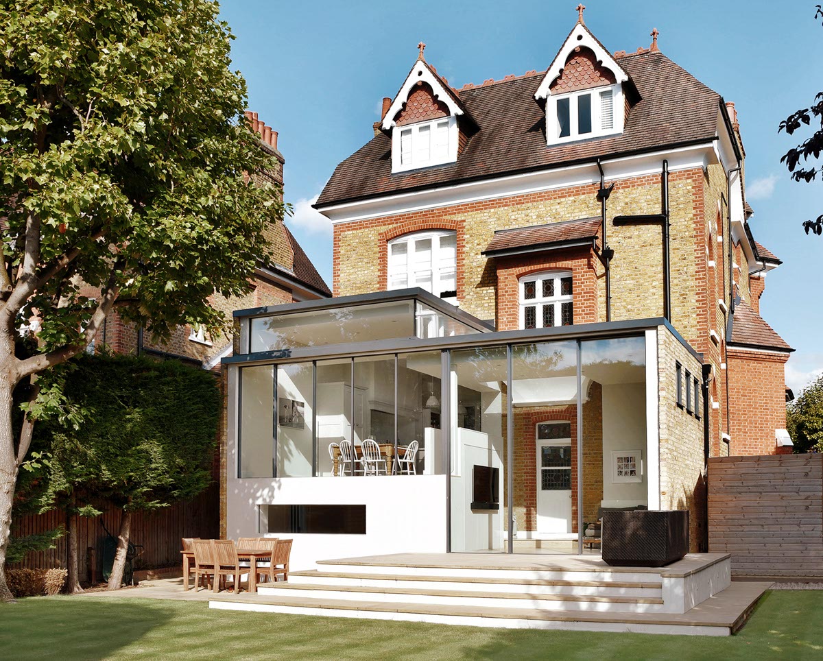 Our client asked for the complete refurbishment of his detached house in Putney as well as the replacement of a draughty conservatory with a dramatic rear extension to house a kitchen/breakfast room, a gym and a living room that connected directly to the garden. The two areas, on different levels, are connected by a stair which leads down from the breakfast area to the lofty living room. Below the breakfast room is a gym with a long window, its height set to allow views out when on an exercise bicycle. The project features 3.5m high sliding doors with minimal glazing bars, clerestory glazing that adds height to the breakfast area and a rooflight that brings light down to the back of the living room. The original exterior door with its surrounding brickwork and the curved base of the oriel window above it become features within the new living room.