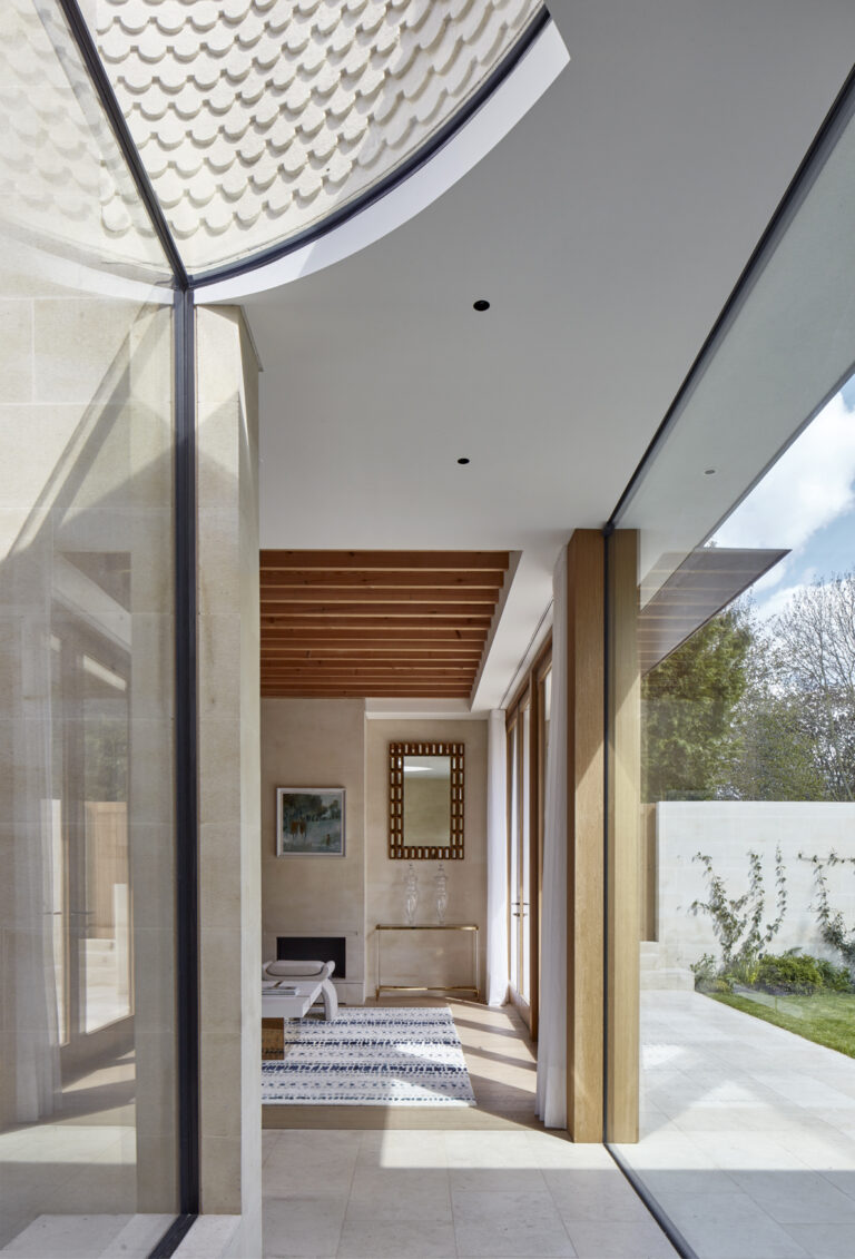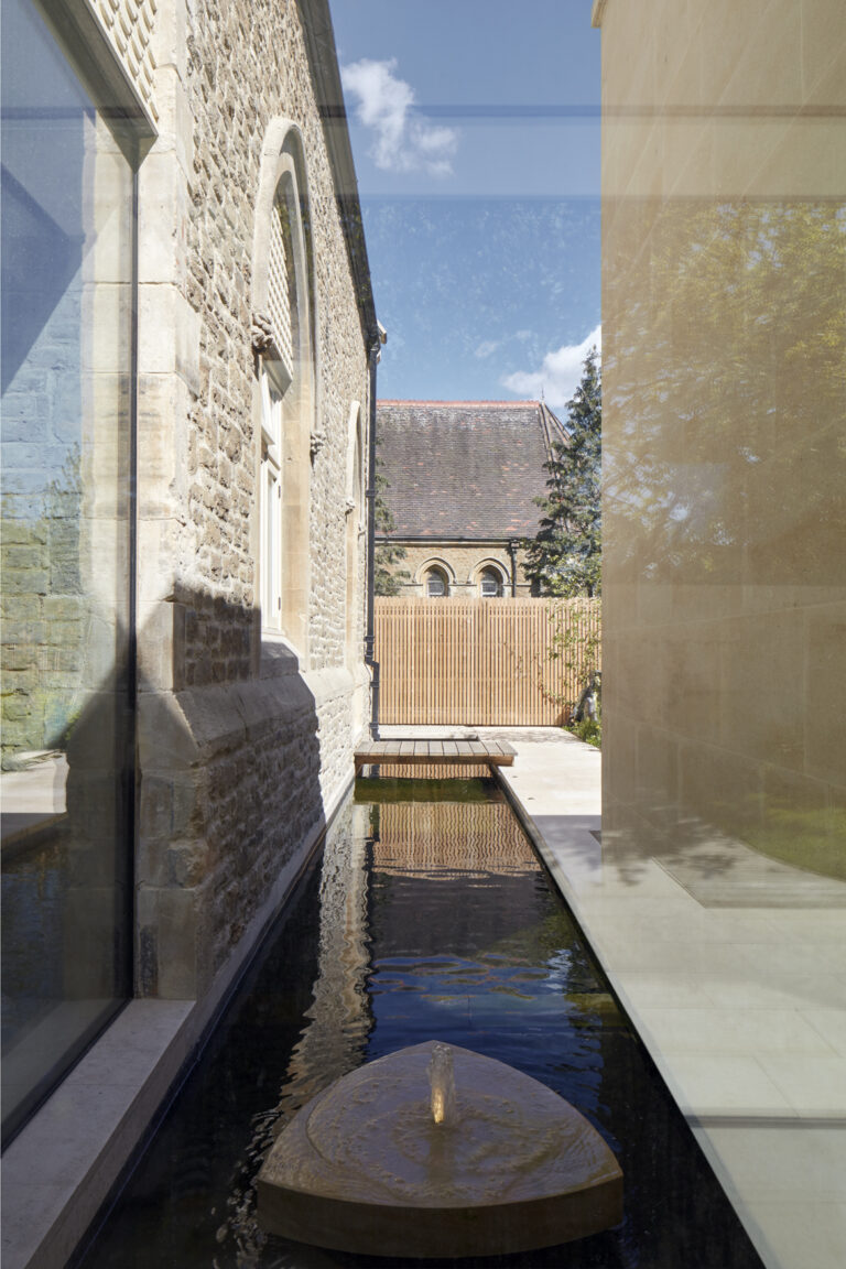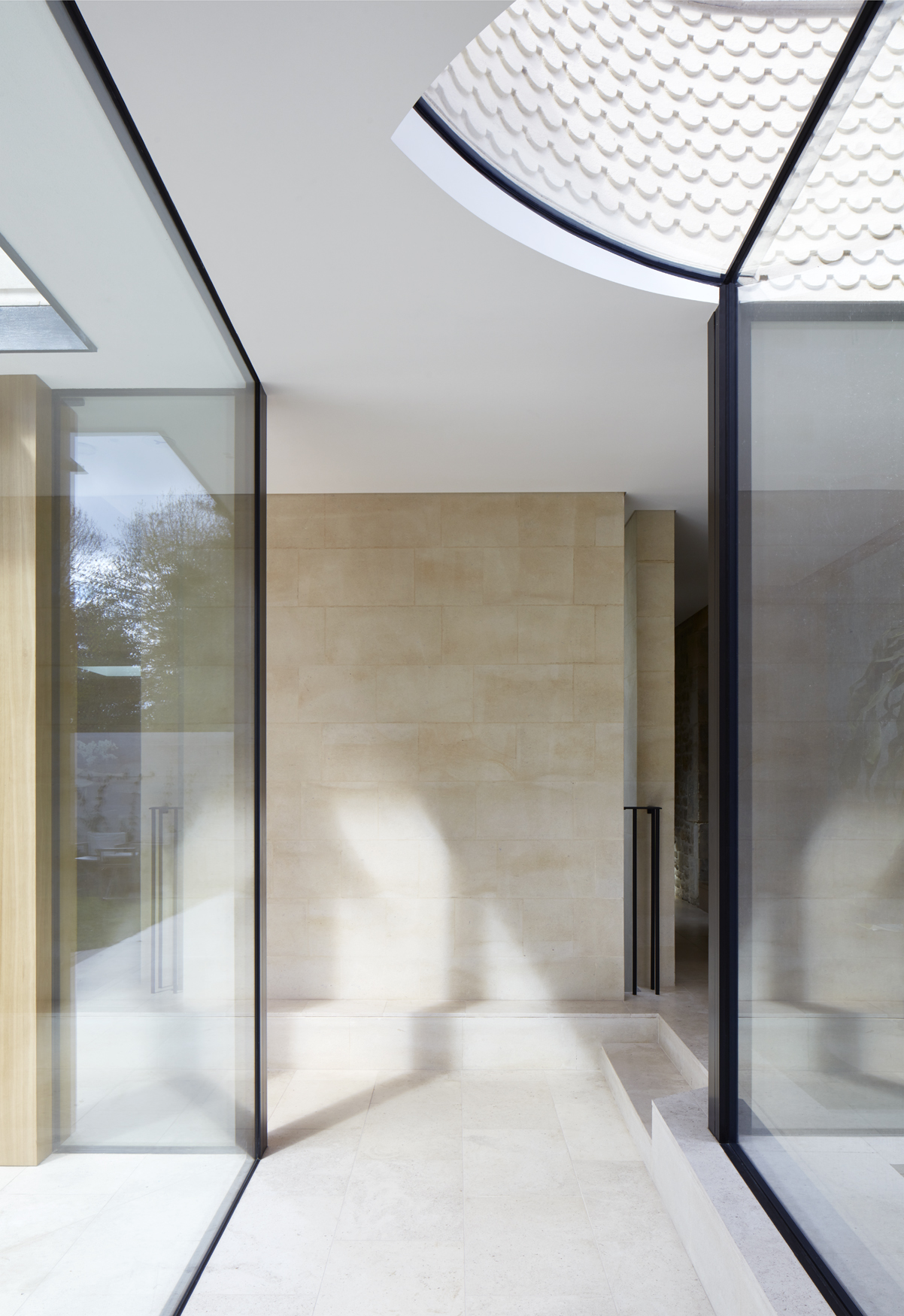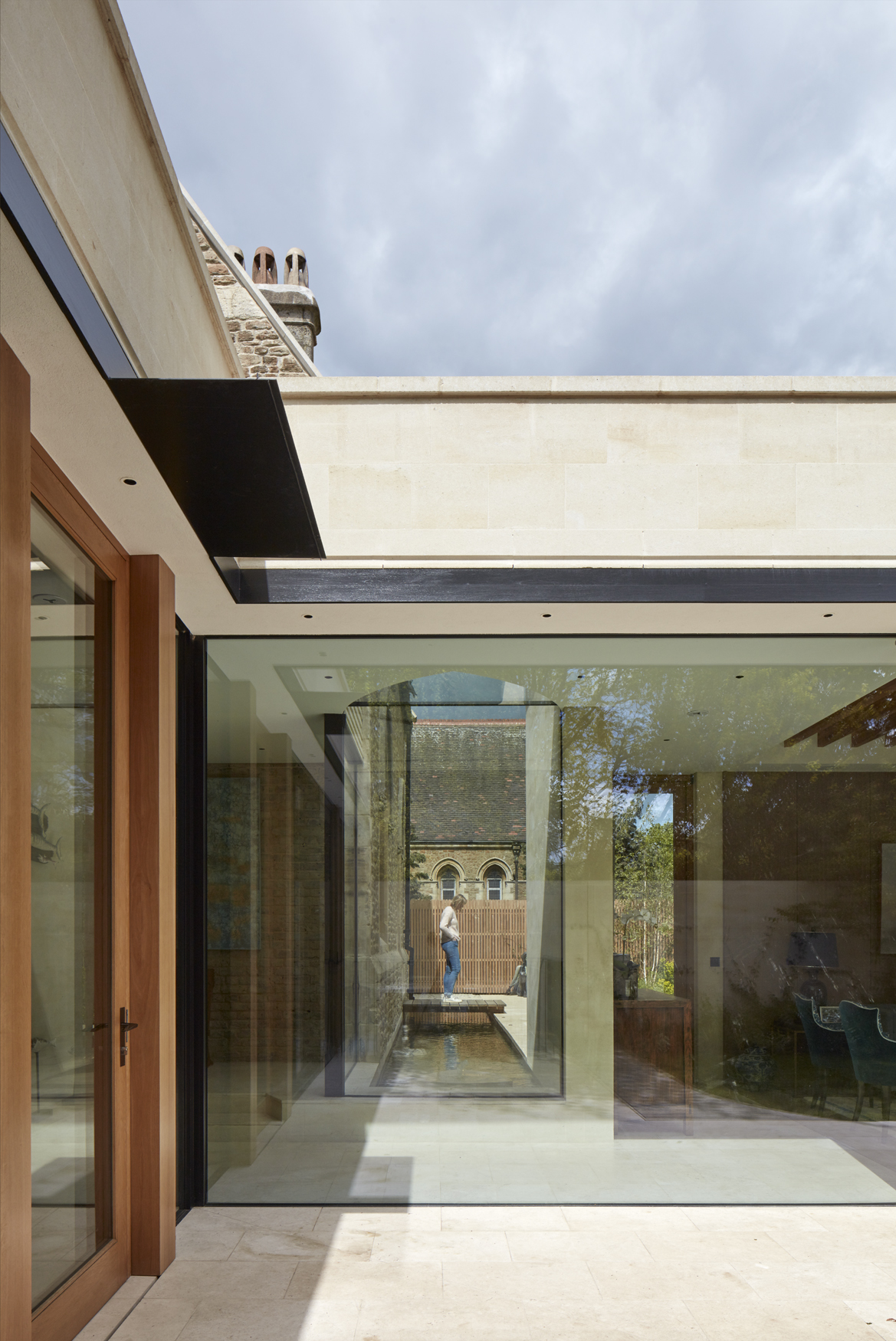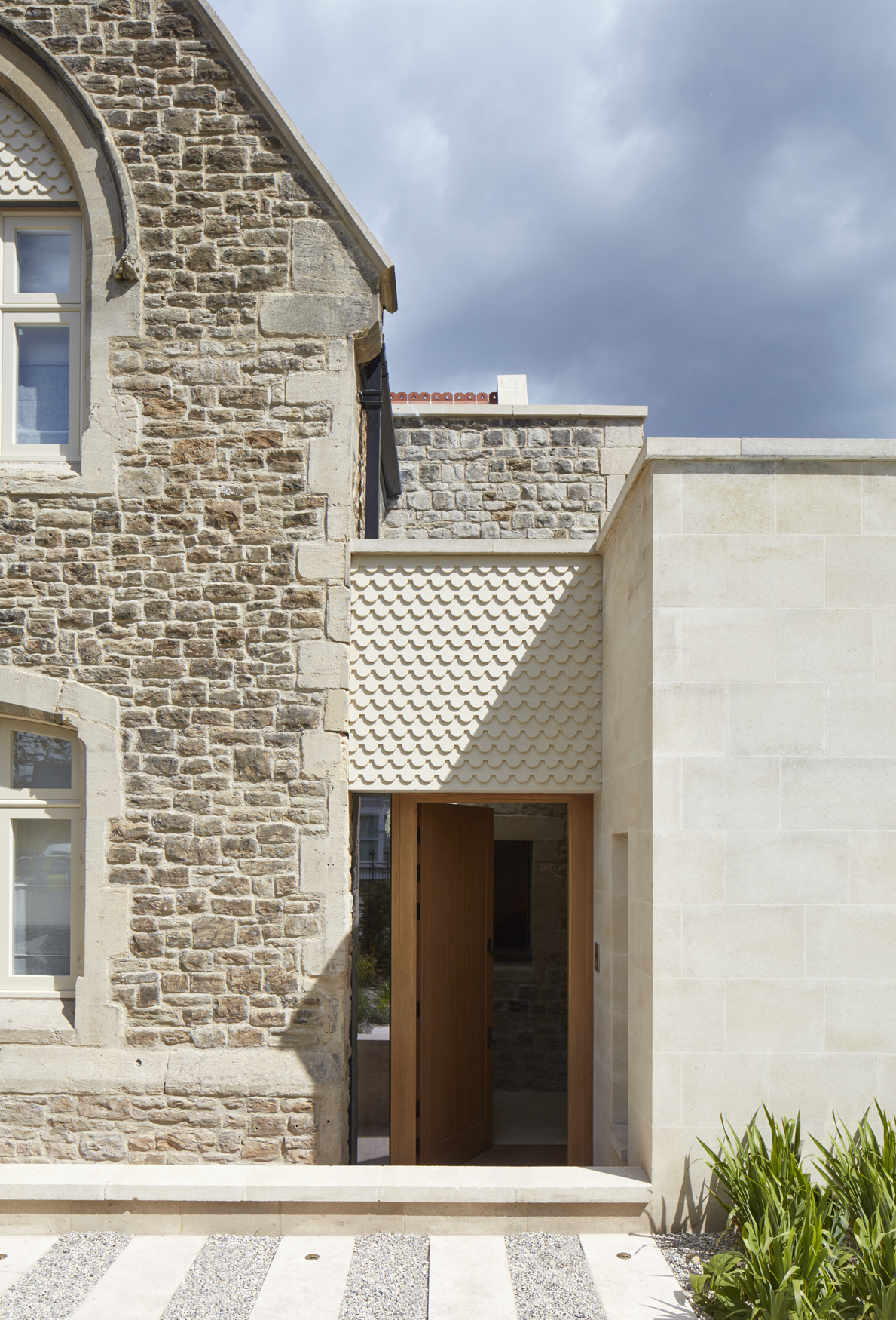 The building and gardens as a whole become a series of connected volumes and voids recalling the house of the great gothic revivalist Pugin and the ideal settlement he planned at Ramsgate. The extension is built of Bath stone to match the cottage with zinc and sedum roofs.