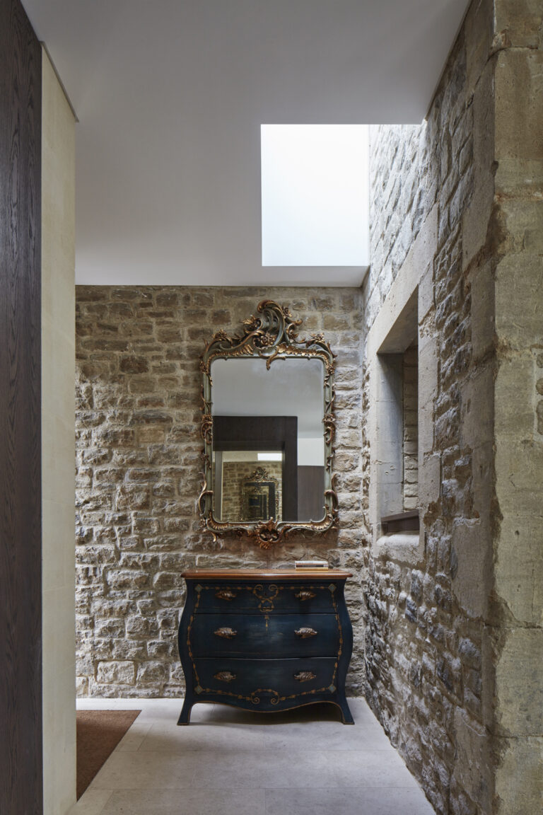 A garden wall gives privacy from the cemetery with small gardens arranged around the extension to maximise views out and light coming in. The new extension sets up a dialogue with the neo-Gothic cottage by being built in a contemporary language of architecture, and also by deploying the new work in a way that allows an altered reading of the old. For example a “moat” is extended along one side of the cottage so that it gives the impression of a fortified manor house.