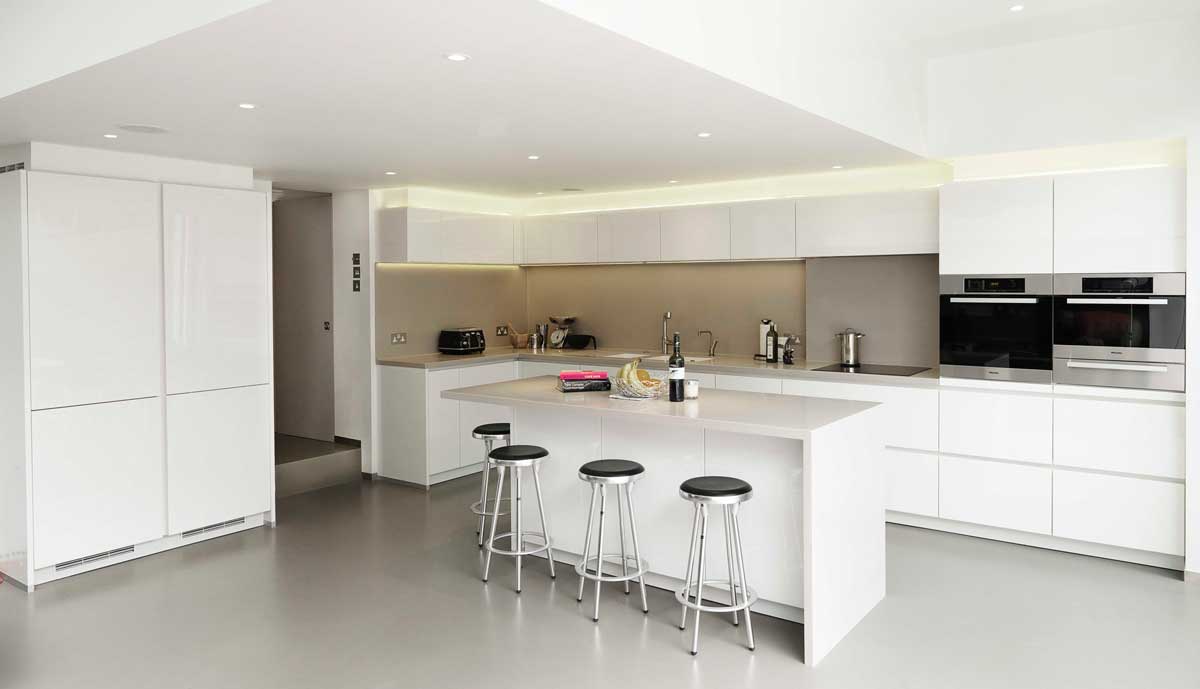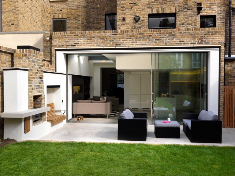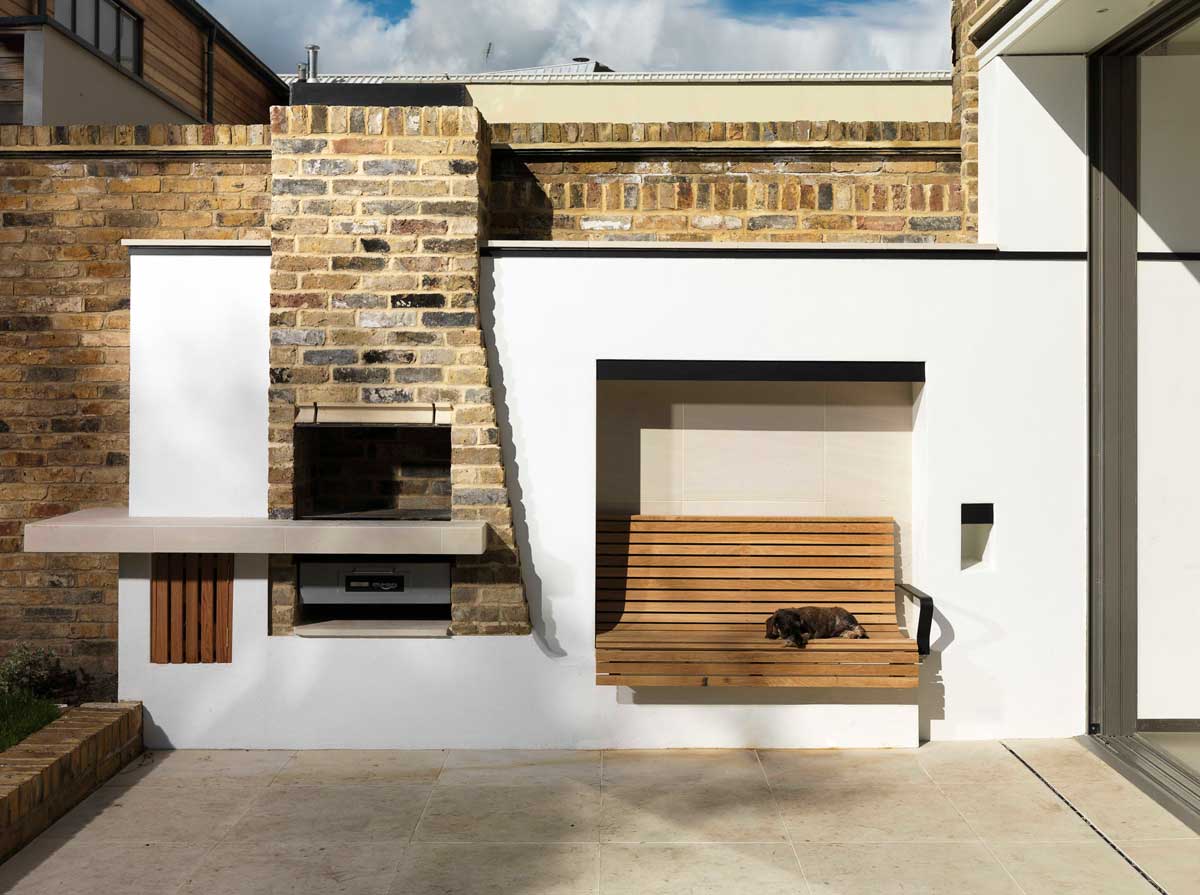 Gretel (a wire haired miniature dachshund) found her existing conservatory and kitchen cold and too disconnected from her garden. This Fulham scheme therefore replaces the conservatory with a new extension that opens out the interior to the garden. Her requirement for the possibility of being fed titbits of grilled sausages led to the design including a barbecue, which becomes an extension of the side wall to the kitchen/ living area.