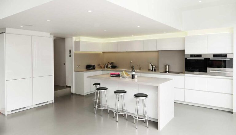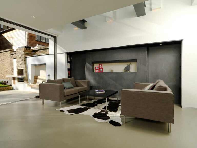 There is an adjacent seat where her owners can sit and pamper her in the sun. The main opening of the sliding doors has an outside covering “raincoat” of brick with a smooth inner lining which expresses the cavity wall and creates a sense of interior comfort. Bespoke cast stone forms a masonry course over the lintel which resolves the weight of the wall above and emphasises the openings of the weep holes. Inside, a polished plaster niche runs along the side of the living area. The floor is resin with underfloor heating, providing a comfortable lounging surface that pleasantly warms her tummy.