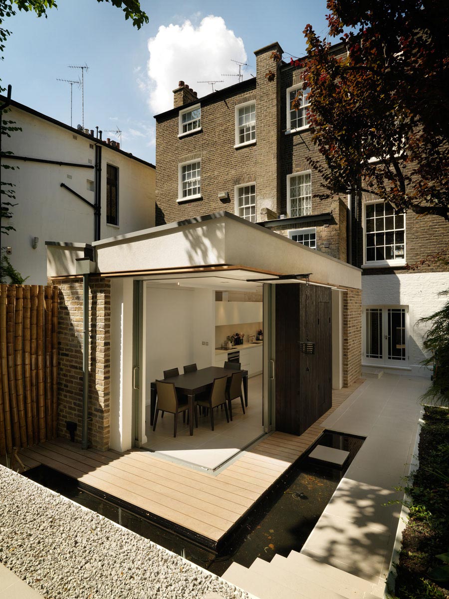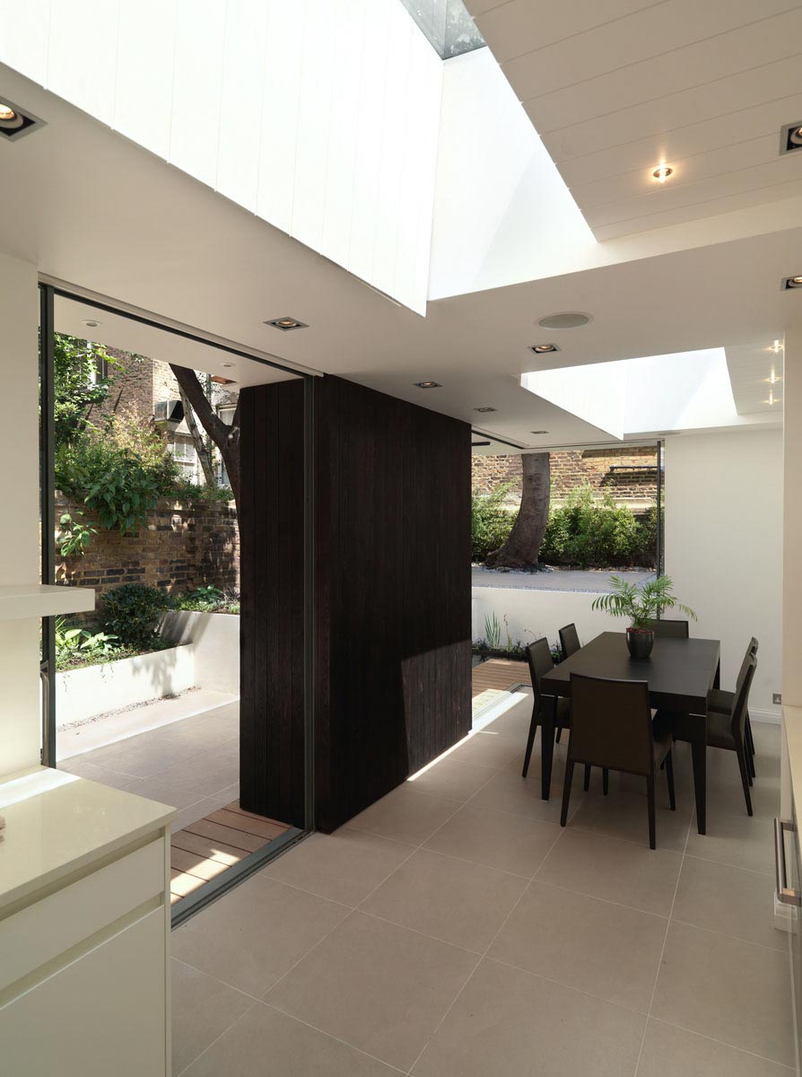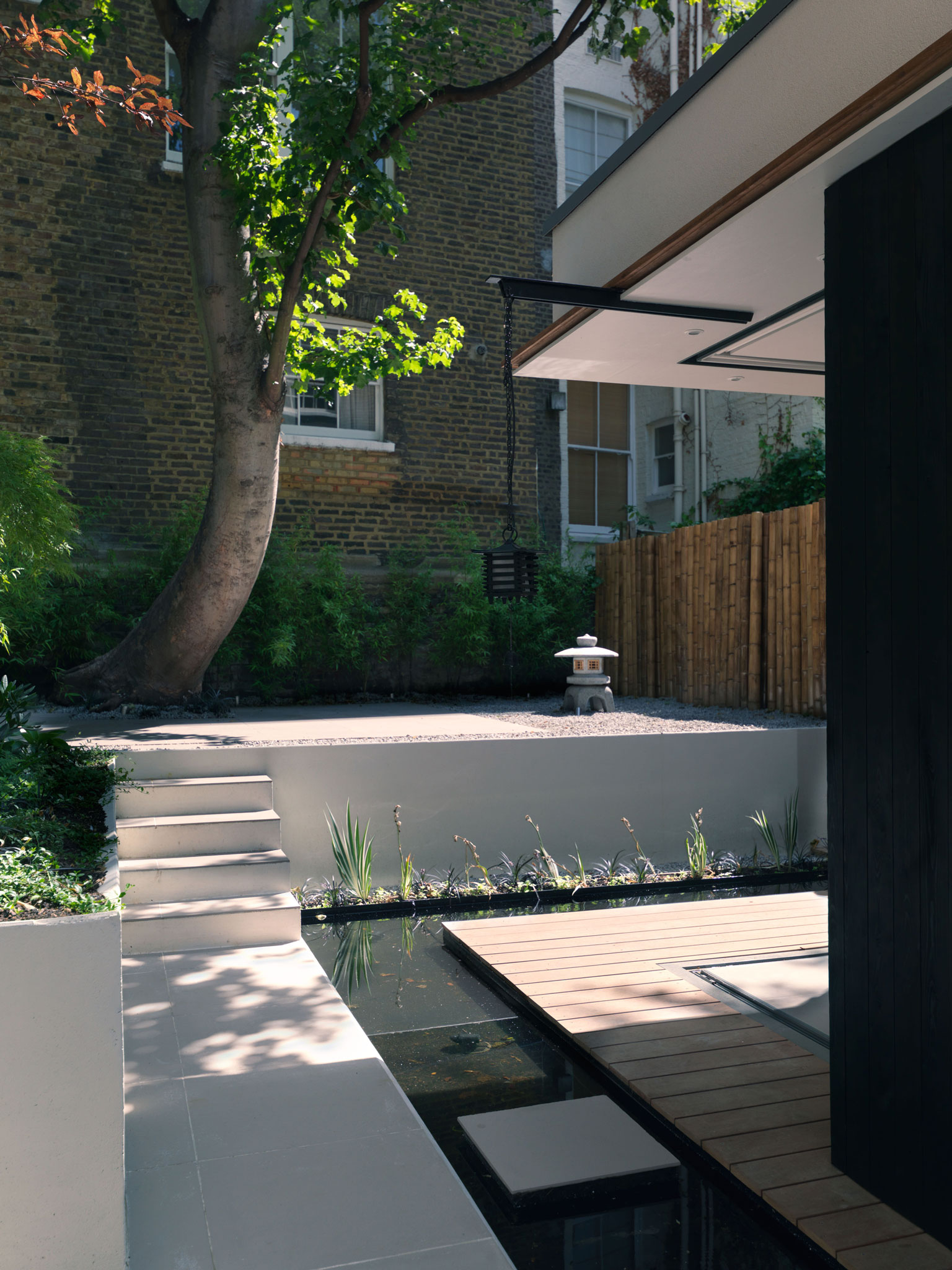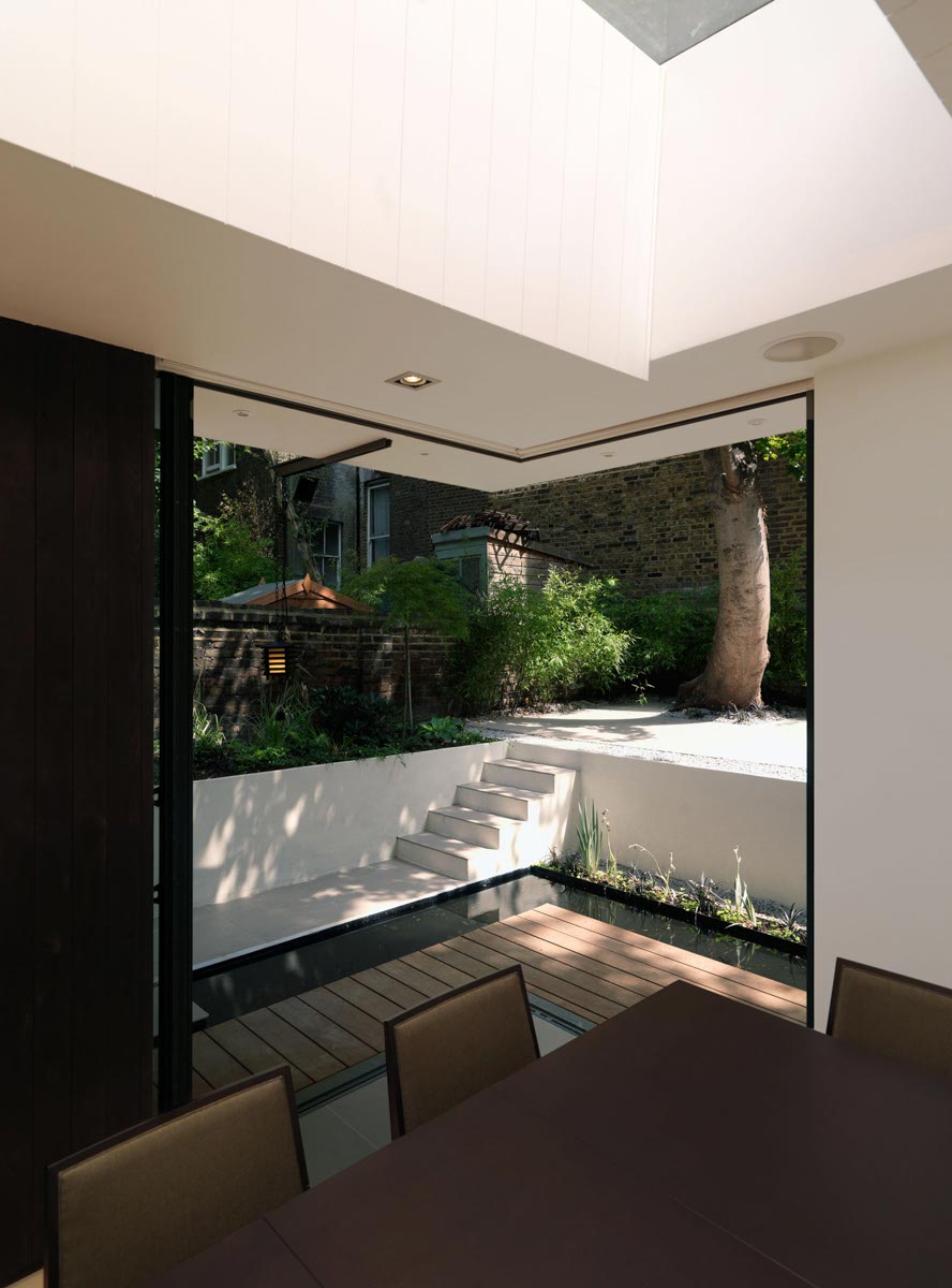 Decking runs around the perimeter of the extension in the Japanese manner, over-sailing a pond that provides rippling reflections on the soffits. Large skylights provide direct sunlight into the extension, and have hanging panels to reflect light back onto the darker side wall of the extension which, as a party wall, was unable to have windows.