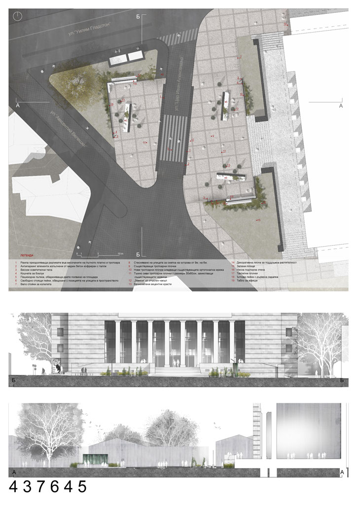 Whilst space is necessarily split by Tsar Ivan Alexander Street, the placing of two, diagonally opposite emphasized corners implies a unified square that relates directly to the façade and entrance to the building.